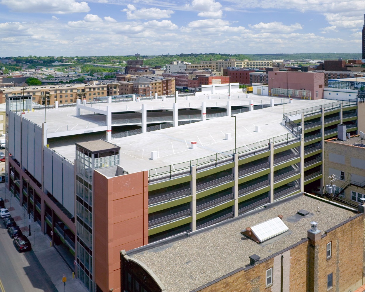 The Block 19 Parking Ramp is part of a larger transportation and parking network that makes the City of St. Paul more vital and pedestrian-oriented by providing motorists with improved parking within a convenient walk to businesses and housing. The new eight-level parking ramp includes 1,028 public parking spaces for both long-term and hourly parking, a secure environment for parking patrons, 1,200 sf of street level retail space, and a design that complements the surrounding turn-of-the-century warehouse neighborhood. CDG provided architectural design for the ramp, which is owned by the Housing and Redevelopment Authority of the City of St. Paul.