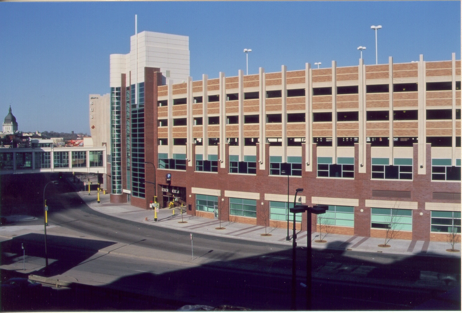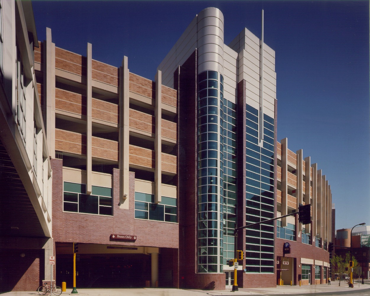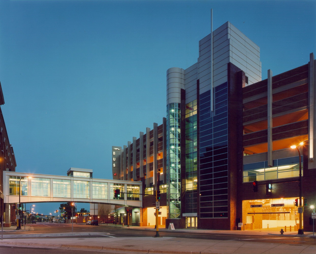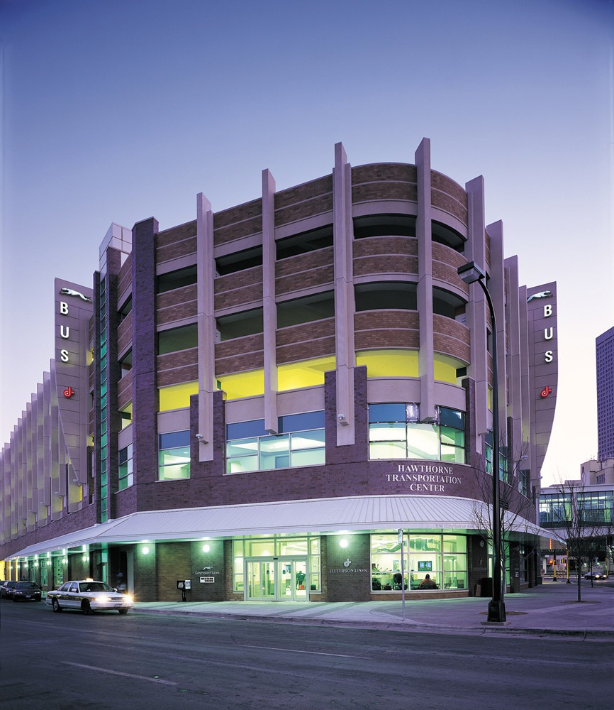 The Hawthorne Transportation Center incorporates a multi-modal bus terminal with convenient ramp parking and access to the Orpheum Theater by skyway system. It provides a variety of services, such as combined operations and transportation offices, centralized security for all city ramps, and the Greyhound/Jefferson Terminal and Charter Bus Facilities. Highlights of the design include a 17,500 sf Greyhound/Jefferson Bus Terminal, 975 stalls, state-of-the-art monitoring system to alert drivers of vacant parking spaces, bicycle lockers, showers and changing rooms, and 24,000 sf of City parking operations and accounting offices and security center to serve all City of Minneapolis parking ramps. Building flexibility allows for possible future growth, such as additional skyway systems, airport shuttle service, airline ticketing offices, and light rail connections.