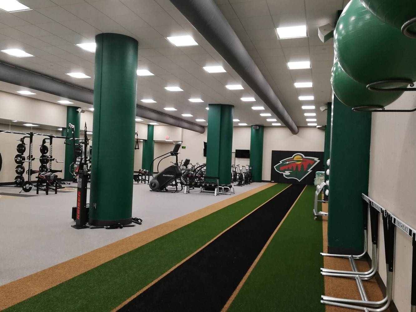 Collaborative Design Group designed the renovation and reuse of the historic Macy’s Building in downtown St. Paul. The former department store building, now known as the Treasure Island Center, was completely transformed to feature retail, restaurant, and office spaces on the lower levels. The basement houses the Minnesota Wild practice facility, which features two locker rooms, including one with state-of-the-art mechanical equipment that allows the team to sanitize and control smells without removing equipment from the room. Showers, sauna, hot tubs, weight and training rooms, meeting areas, treatment rooms, equipment storage, offices, and a players’ lounge and kitchen make up the rest of the space, which is accessed by the building’s parking garage and has elevators to take players and coaches to the upper level practice rink.